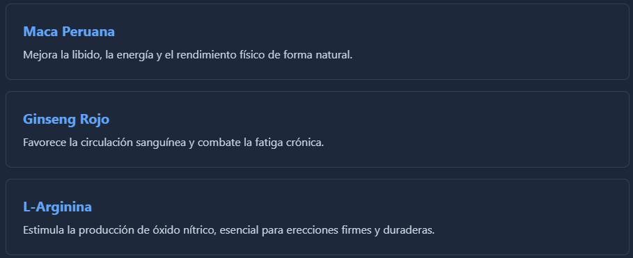 Este proceso mejora el flujo sanguíneo hacia los músculos y órganos reproductivos, potenciando el rendimiento físico y sexual. A su vez, los extractos naturales favorecen la regeneración celular, reducen la inflamación y equilibran las hormonas.