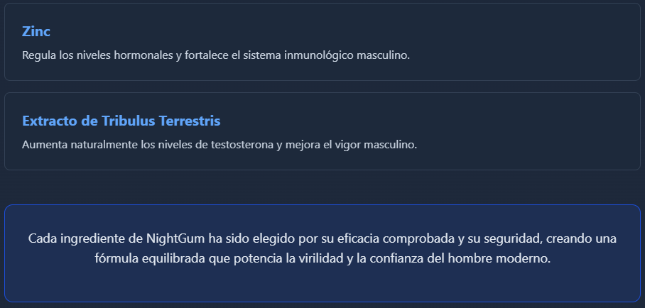 En pocas palabras: NightGum actúa desde dentro hacia afuera, restaurando la vitalidad masculina a nivel hormonal, físico y mental.